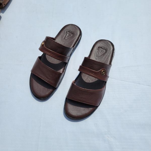 Experience superior comfort and timeless style with our premium double-strap leather slides. Crafted from high-quality leather in a sophisticated chocolate brown, these sandals feature a distinctive dual-strap design with elegant metallic button detailing. The ergonomic footbed is embossed with our signature logo, providing both brand authenticity and enhanced grip. Perfect for both indoor and outdoor wear, these slides combine durability with refined aesthetics.