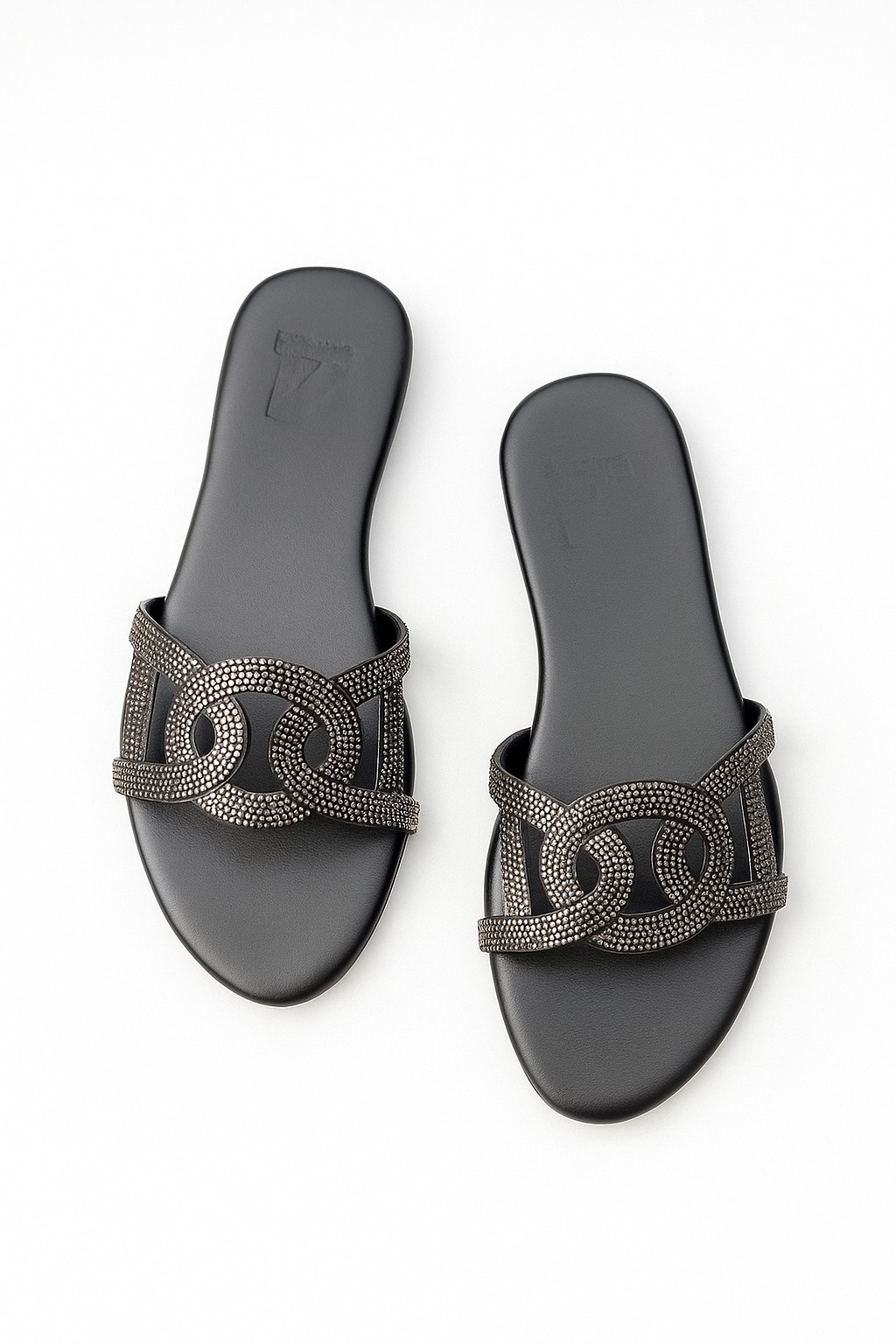 Make a statement with these stunning embellished slides that bring just the right amount of sparkle to your day. The wide black leather strap features an intricate circular pattern covered in tiny rhinestones that catch the light beautifully as you walk. It’s the perfect way to dress up any outfit without trying too hard.